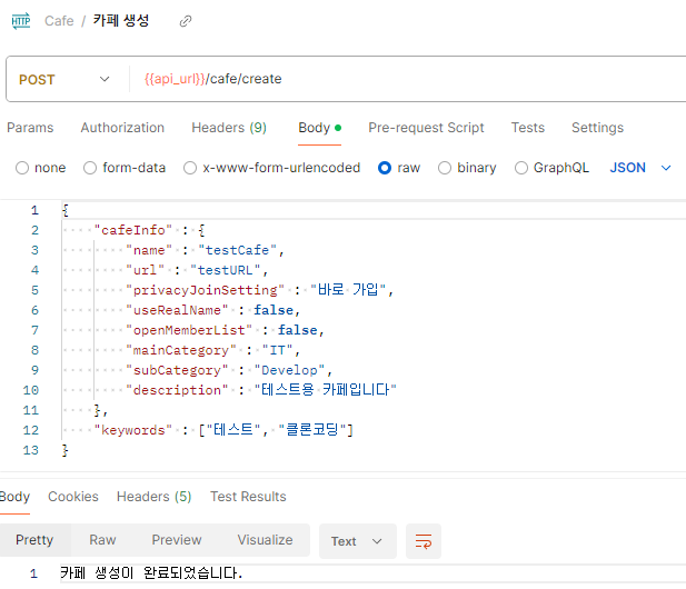 API 요청에 카페 가입 정보를 담았을 때 정상적으로 카페가 생성된 것을 확인 할 수 있었다.