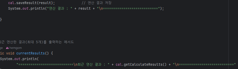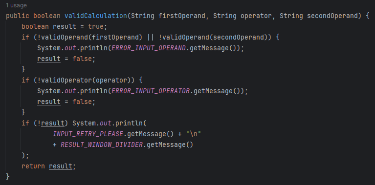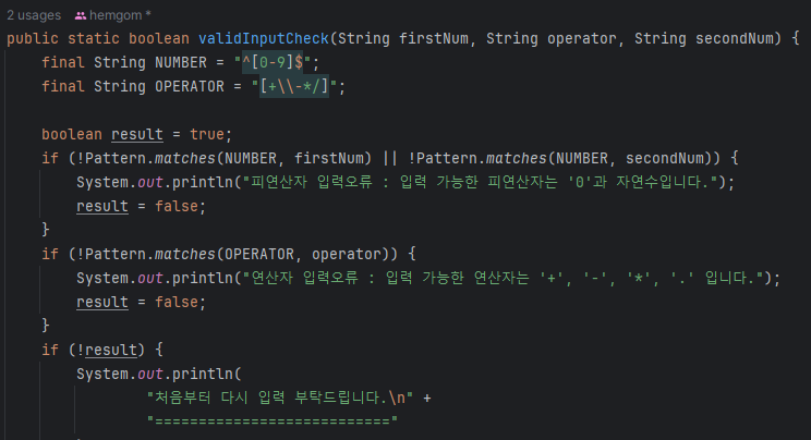 Enum 클래스들을 static 으로 import 하여 열거 상수 사용시 Enum 클래스 명을 지정하지 않아도 열거 상수를 사용할 수 있게 하였고, 문자열을 출력하는 메서드에 열거 상수의 값(message)을 사용하였다. 위의 이미지를 보면 앞으로는 피연산자 입력 오류 메시지(ERRO_INPUT_OPERAND)를 SystemMessage 클래스에서 수정하면 해당 메서드에도 변경 값이 전파되고 같은 상수의 값을 사용하는 모든 필드 및 메서드 또한 전파된다. 이제 한 곳에서 출력 값을 관리할 수 있게 되었다!