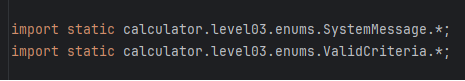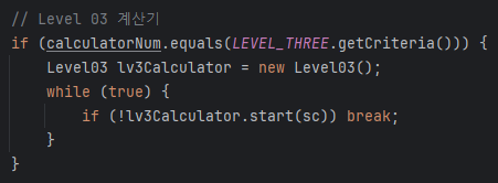 이전에 작성해둔 코드와 현재 작성하는 코드의 차이점을 비교하기 위해 지금까지 'level' 이 다른 계산기를 구현할 때마다 서로 분리하여 구현하였다. 이번 'level03' 계산기 또한 같은 방식으로 구현하였으며 'Main' 클래스 필드에 아래의 코드를 작성해 입력 값이 '3' 일 때 'level03' 계산기가 사용되게 하였다.
