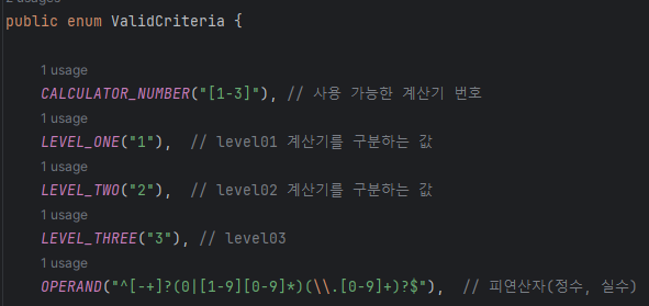 일단 크게 세 가지의 목표를 세워 구현에 들어갔다. 첫 번째는 기존의 유효성 검증에 필요한 정규식이나 특정 문자열, 시스템 메세지들은 모두 출력문에 그대로 작성하였는데 이 걸 'level03' 계산기에서는 한 곳에서 다룰수 있게 Enum 클래스들을 구현해 활용하는 것, 두 번째는 기존 'level01', 'level02' 계산기와 별도로 기능이 동작하도록 분리하여 구현할 것, 마지막은 이미 구현된 클래스 및 메서드를 재사용하는 것이다.