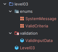 수행 결과를 스포(?)하자면 위와 같이 패키지를 구성하게 되었다. 'level03' 패키지는 'level03' 계산기의 수행로직을 작성한 'Level03' 클래스와 계산기 수행에 필요가 고정값들을 집합인 Enum 클래스들이 위치한 'enums' 패키지, 입력 값들의 유효성을 검사하는 클래스가 위치하는 'validation' 패키지로 구성되었다.