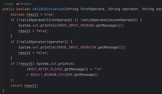 위 이미지의 메서드는 'level03/validation/ValidInput.validCalculation()' 메서드이다. 해당 메서드에 부여한 주 역할은 입력 값의 유효성을 검증하는 것인데, 현재 '검증' 뿐만 아니라 '출력' 도 같이 수행하고 있다. 그리고 메서드의 반환 타입이 boolean 인데 이러한 메서드가 여럿 되다 보니 추후에 다시 메서드를 사용할 때, "어? 이거 어떨 때 true 고 false 이지?" 하는 자신을 발견할 수 있었다. 더욱이 boolean 타입은 개인의 생각에 따라 true(or false) 를 반환하는 경우가 다를 수 있기에 다른 개발자가 코드를 파악하는데 어려움을 줄 수 있다.