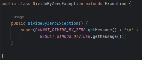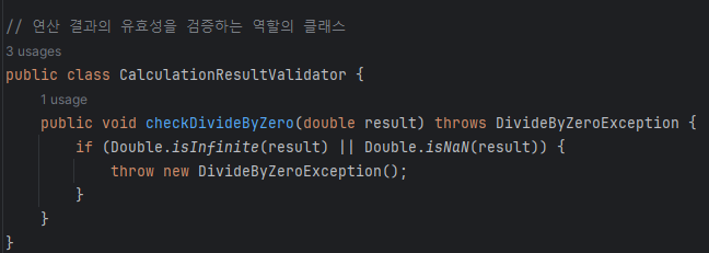 우선 연산 결과의 유효성을 검증하는 'CalculationResultValidator' 클래스를 생성하고 'checkDivideByZero(double)' 메서드를 작성해 결과가 'Infinity' 또는 'NaN' 인 경우 예외가 발생하도록 하였다. 사용할 예외로 'DivideByZeroException' 예외 클래스를 생성하였는데, 해당 예외는 미리 지정해둔 시스템 메시지를 갖도록 하였다.