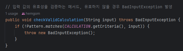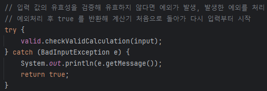 연산(입력 값)에 대한 유효성을 확인하는 'checkValidCalculation(String)' 메서드이다. 만약 유효하지 않다면 'BadInputException' 이 발생, 예외의 처리 책임은 메서드를 호출한 곳으로 넘긴다. 그래서 아래의 이미치처럼 발생한 예외를 'Level04.start()' 메서드에서 처리하도록 구현했다.