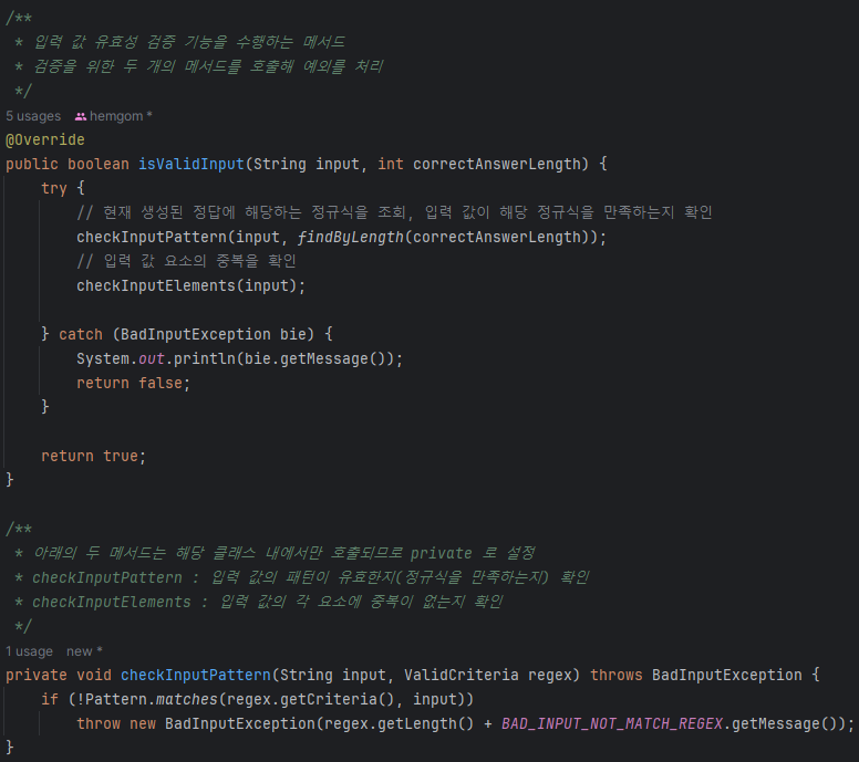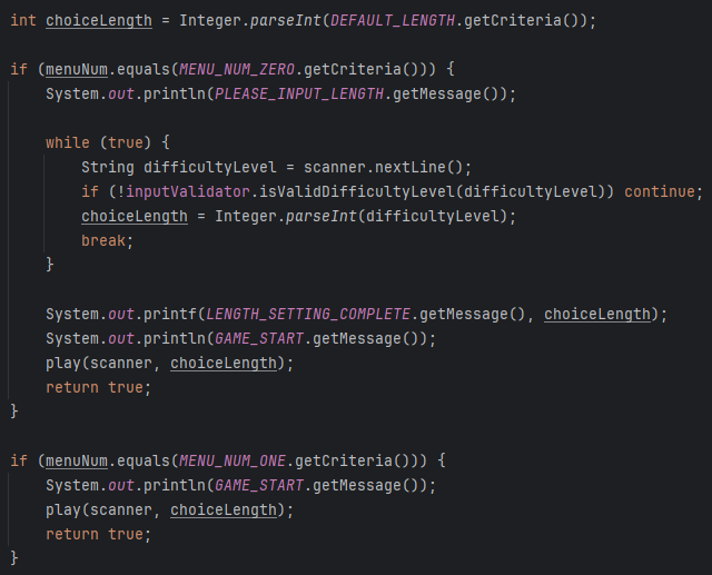 '입력 값' 의 검증은 'ValidCriteria' 클래스(enum) 의 상수에 필드로 저장한 '정규식(Regular Expression)' 을 활용하였는데 '자릿수 설정' 메뉴에 따라 적절한 정규식을 사용하도록 아래와 같이 수정하였다. 그리고 난이도 설정 입력에 대한 유효성을 검증하는 메서드 또한 추가하였다.