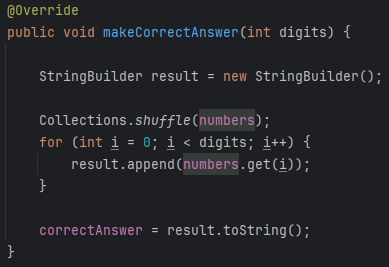 'makeCorrectAnswer()' 메서드를 통해 정답을 생성하고 'getCorrectAnswer()' 메서드로 생성된 정답을 반환한다. 여기서 수정이 필요한 것은 'makeCorrectAnswer()' 메서드인데 보다시피 호출시 항상 '3자리' 의 정답을 생성한다. 이를 사용자의 입력에 따라 길이가 다른 정답을 생성하도록 하기 위해서는 파라미터로 입력 값을 전달받을 필요가 있다. 그리고 그 입력 값만큼 클래스 필드의 'numbers' 에서 요소를 가져오면 된다 생각해 아래와 같이 메서드를 수정했다.