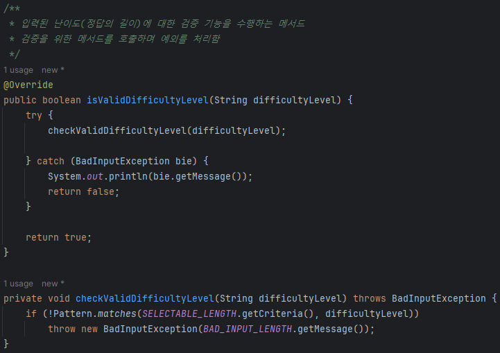 물론 추가된 'isValidDifficultyLevel(String)' 메서드는 구현한 인터페이스에 추상 메서드를 추가하였고, 각 검증에서 사용되는 시스템 메시지 및 예외 메시지를 필드로 갖는 상수 또한 해당하는 enum 클래스에 추가 또는 수정하였다.