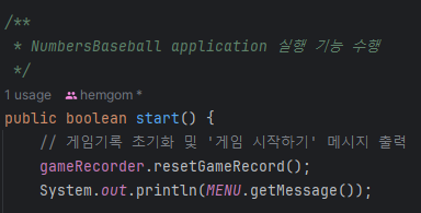 그래서 위의 이미지와 같이 'NumbersBaseballApp' 클래스의 필드에 '기본 자리수' 값을 갖는 상수를 추가하였다. '1. 게임 시작하기' 를 선택하는 경우 'int defaultNumberLength' 을 파라미터로 사용해 게임을 플레이할 수 있다. '0. 자리수 설정하기' 의 경우에는 기존처럼 사용자가 입력한 값을 파라미터로 사용해 게임을 플레이하게 된다.