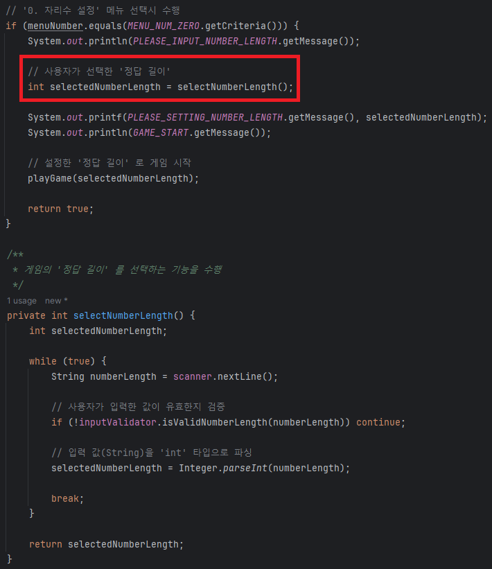 'selectNumberLength()' 메서드는 'start()' 메서드의 수행부에서 '사용자가 정답의 길이를 입력하는 로직' 을 분리한 것으로 문자열을 입력 받아 'int' 타입으로 파싱한 값을 반환한다.