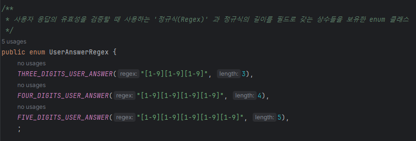 하지만 ValidCriteria 클래스에 조회 메서드를 구현하게 되면서, 구지 'length' 필드가 필요 없는 상수들 또한 필드를 추가하게 되었고 또한 조회 메서드 사용 시, 찾고자 하는 상수가 아닌 상수들도 반복문을 통해 비교해야 하는 불필요한 수행을 하게 되었다. 그래서 정답을 맞힐 때 입력하는 값의 유효성 검증 시 사용되는 정규식(Regex)을 필드로 갖는 상수들을 따로 아래와 같이 분리하게 되었다.