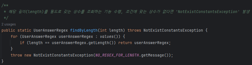 UserAnswerRegex 클래스에서 길이를 파라미터로 받아 상수를 조회하는 'findByLength(int)' 메서드는 해당 클래스의 모든 상수의 'length' 필드와 파라미터를 비교해 같은 값을 갖는 상수가 있을 때 해당 상수를 반환하고 없다면 예외를 발생시킨다.