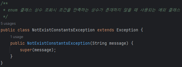 하지만 기존처럼 'BadInputException' 을 발생시키는 것은 명확한 예외를 파악하기 힘들게 하므로 아래와 같이 '상수가 존재하지 않는다' 라는 의미를 파악할 수 있는 'NotExistConstantsException' 을 추가적으로 구현해 사용했다.