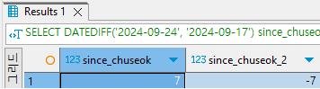 SELECT DATEDIFF('2024-09-24', '2024-09-17') since_chuseok,