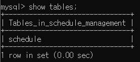 하지만 현재 'schedule_management' 테이블은 초기 상태이므로 생성된 Table 이 없어 위 처럼 'Empty set' 이란 메시지가 출력되었다. 말 그대로 현재 '텅 빈' 상태를 의미한다. 그럼 ERD 에 작성한 'schedule' Table 을 생성해보자.