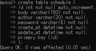 모든 Column 은 'Null' 을 허용하지 않도록 'NOT NULL' 옵션을 적용했고, 해당 테이블의 기본 키(primary key, 고유)인 'id' Column 은 레코드(행)가 추가될 때마다 자동으로 값이 증가하도록 'AUTO_INCREMENT' 옵션을 적용했다. 또한 마지막에 'primary key (id)' 를 통해 'id' 컬럼을 기본 키로 등록해 ERD 와 좀 다르나 기존에 생각해둔 'schedule' 테이블을 생성할 수 있었다.
