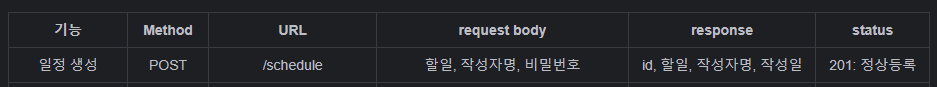 일단 미리 작성해둔(약간 수정을 하긴함) 'API 명세서' 를 보면 애플리케이션 서버는 '할 일, 작성자 이름, 비밀번호' 정보를 받아 일정에 대한 정보(Entity)를 DB 에 저장한 뒤, 응답할 때 저장된 데이터 중 'id(일정 ID), 할 일, 작성자 이름, 작성일' 정보를 함께 전달해 주어야 한다.