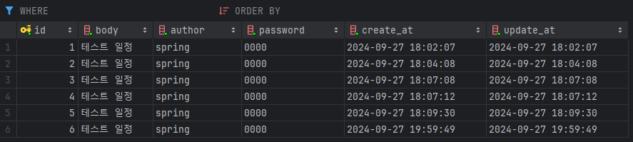 이전에 구현된 것이 없어 IntelliJ 를 DB 와 연결해 두었는데, 연결해두면 이렇게 MySQL Command line Client 나 MySQL Workbench 를 통하지 않고도 IntelliJ 내에서 현재 연결된 DB 의 상태를 확인할 수 있다. 테스트를 진행하며 테이블에 레코드가 쌓였지만 'id' 값이 '6' 인 레코드가 확인되므로 DB 에 요청으로 인해 생성된 일정이 잘 저장됬음을 확인할 수 있다.