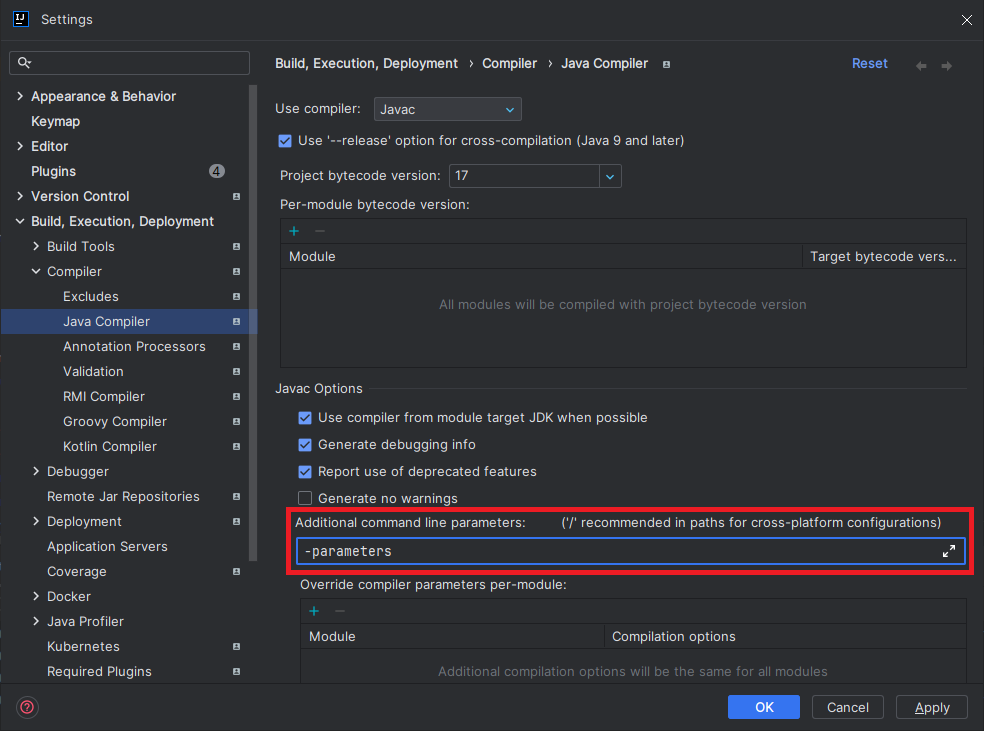 'Settings → Build, Execution, Deployment → Compiler → Java Compiler' 에 위치한 'Additional command line parameters' 항목(= 아래의 빨간 박스 영역)에 "-parameters" 입력 후 'Apply → OK' 버튼을 누른다. 혹시 모르니 IntelliJ 를 재실행해 준다.