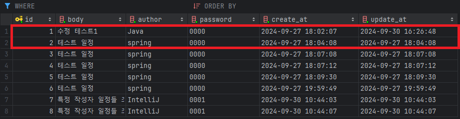 위에서 말한대로 'id=1' 인 레코드의 경우 일정 정보가 수정되었고, 'id=2' 인 레코드의 경우에는 일정 정보가 수정되지 않은 것을 확인할 수 있다.
