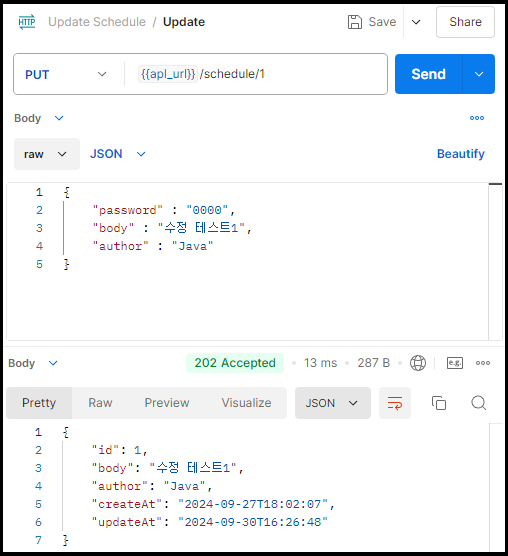 요구사항에서의 포인트는 사용자가 입력한 '비밀번호' 와 DB 에 저장된 일정의 '비밀번호' 가 같을 때만 수정이 되어야 하는 것이다. 물론 사용자가 지정한 'id' 에 해당하는 일정이 DB 에도 존재해야 한다.