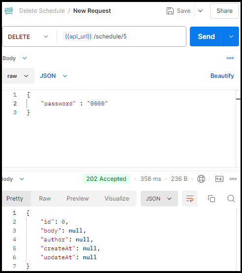 사용자가 올바르지 않은 비밀번호를 입력했기에 '일정 삭제' 가 수행되지 않아 삭제 대상이었던 일정의 정보가 반환된 것을 확인할 수 있다.