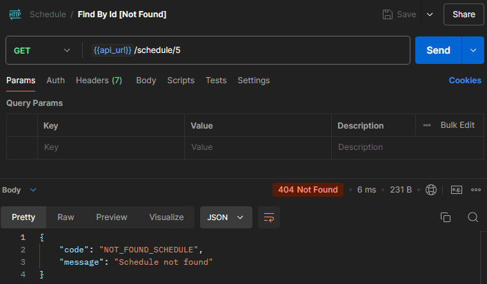 DB 에 존재하는 '일정' 을 조회할 경우 위와 같이 조회한 '일정' 에 대한 정보를 반환해 준다. 하지만 존재하지 않는 '일정' 에 대한 조회를 요청 할 경우 아래와 같이 예외 메시지를 반환해 준다.