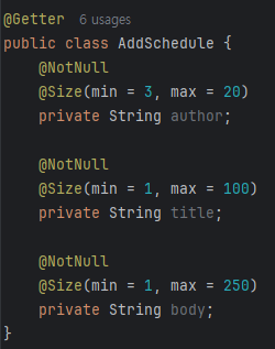 요청 값에 대한 '유효성' 검증의 경우 'validation' 을 사용했는데, 어째서 인지 'title' 필드에 대한 예외가 응답에 표기되지 않았다. 아래는 '일정 생성' 에 대한 요청 파라미터를 담는 'AddSchedule(DTO)' 로 각 필드에 'validation' 의 어노테이션을 사용해 유효성에 대한 조건을 추가해 준 상태이다.