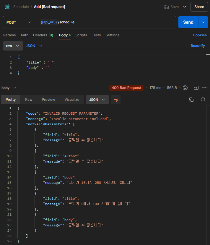 앞서 말한 부분은 해결되었지만 각 필드에 지정된 어노테이션 마다 예외가 발생했다보니 같은 필드에 하나 이상의 예외 메시지가 반환되었다(하지만 위와 같은 상황이 나쁜 것인지는 확신이 없다). 이 부분은 아마 '정규식' 을 검증 조건에 추가한다면 해결될 것으로 보인다. 이후 '작성자(유저)' 에 대한 요구사항이 존재하기에 해당 요구사항을 반영할 때 위의 내용을 염두해 반영하는 것으로 마무리 지었다.