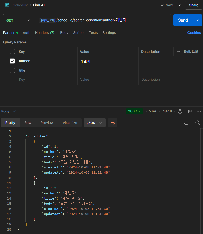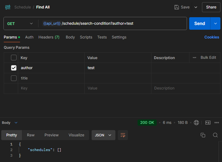 일정 목록 조회의 경우 '작성자명, 일정 제목' 을 검색 조건으로 사용할 수 있도록 구현했다. 두 조건이 없는 경우, 둘 중 한 조건만 있는 경우, 두 조건 모두 있는 경우를 고려해 모두 '일정 목록' 을 조회할 수 있도록 했으며, 이러한 동작을 위해 조회된 '일정 목록' 이 없는 경우 '일정 조회(단건)' 처럼 예외를 발생시키지 않고 아래와 같이 빈 컬랙션을 반환해 조회된 일정 목록이 없다는 것을 알 수 있게 하였다.