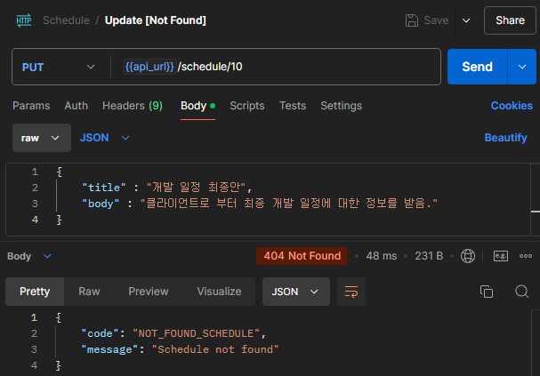 '일정 수정' 시 존재하지 않는 '일정' 에 대한 수정을 요청할 경우 위 이미지와 같이 예외 코드 및 메시지와 '404 Not Found' 를 반환한다.