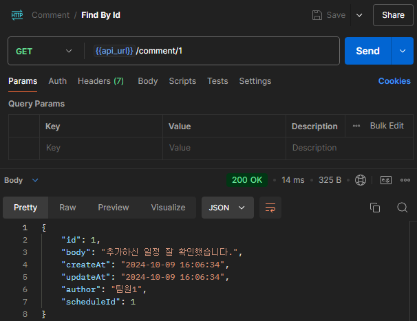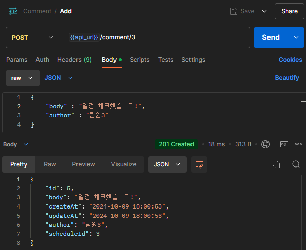 댓글 작성시 쿼리 파라미터와 RequestBody 로 요청 파라미터를 받도록 구현했다. 쿼리 파라미터에는 댓글을 작성할 일정의 'id' 값이 RequestBody 에는 작성할 댓글의 '본문(body), 작성자명(author)' 정보가 담겨있다. 정상 요청을 하면 '201 Created' 응답과 생성된 댓글의 정보가 반환된다.