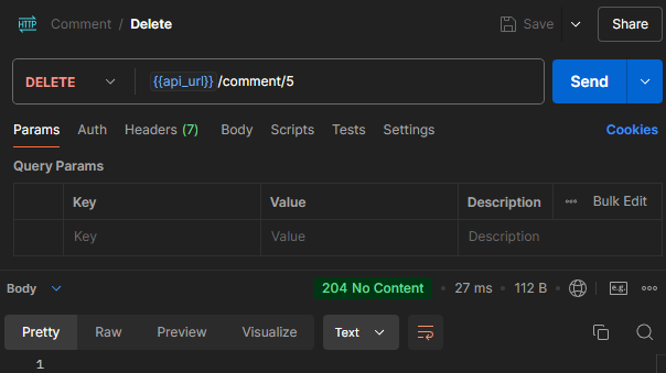 댓글 삭제시 삭제할 댓글의 'id' 를 쿼리 파라미터로 전달 받도록 구현했다. 댓글 삭제시 '204 No Content' 응답을 하며, 별도의 정보를 반환하지는 않는다.