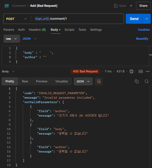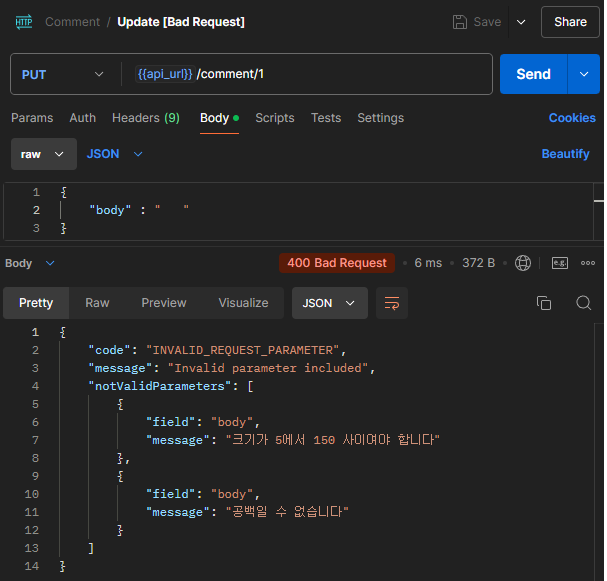 존재하지 않는 댓글 수정 요청시 해당 댓글을 찾을 수 없다는 '404 Not Found' 응답과 예외 코드 및 메시지가 반환되며, 요청 파라미터(body) 가 유효하지 않은 경우 '400 Bad Request' 응답과 예외 코드 및 메시지, 유효하지 않은 파라미터 이름 및 유효하지 않은 이유를 반환한다.
