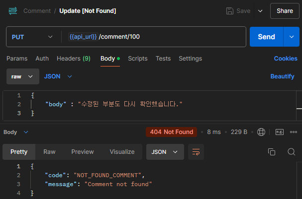 만약 존재하지 않는 댓글의 정보를 수정하려하거나 수정 정보가 유효하지 않은 경우 아래와 같은 응답과 예외 코드 및 메시지를 반환한다.