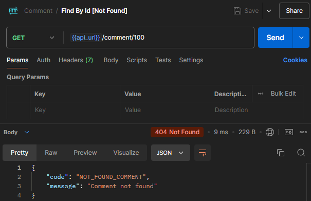 만약 존재하지 않는 댓글에 대한 조회를 요청한 경우 아래와 같이 '404 Fot Found' 응답과 예외 코드 및 메시지를 반환한다.