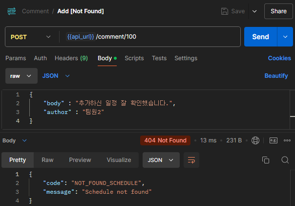 '(1)' 의 경우 존재하지 않는 일정에 댓글을 작성하는 경우이다. '404 Not Found' 응답과 해당 일정을 찾을 수 없다는 예외 코드 및 메시지를 반환한다. '(2)' 의 경우 RequestBody 안의 요청 파라미터가 유효하지 않은 경우이다. '400 Bad Request' 응답과 예외 코드 및 메시지, 유효하지 않은 파라미터 이름 및 이유를 말하는 메시지가 반환된다.