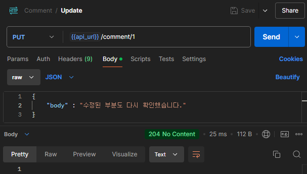 댓글 수정시 댓글의 '본문(body)' 만을 수정할 수 있도록 구현했다. 쿼리 파라미터로 댓글의 'id' 를 전달, RequestBody 를 통해 수정할 'body' 를 전달 받는다. 요청 수행후 '204 No Content' 응답을 하고 별도로 수정된 댓글의 정보를 반환하지 않는다. 왜 수정된 댓글 정보를 반환하지 않았는지는 저번 게시글에 이미 작성을 했으므로 넘어가 보도록 하겠다.