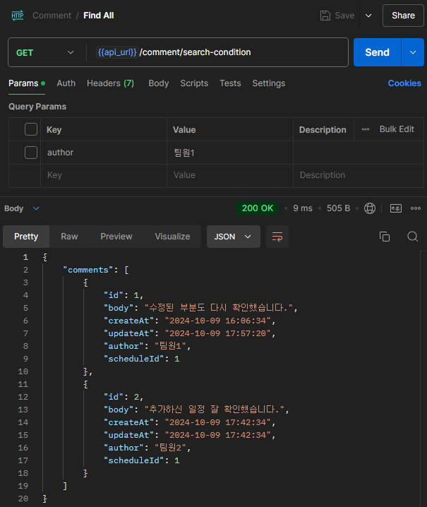 일정 목록 조회 때와 마찬가지로 댓글 목록 조회 또한 검색 조건에 해당하는 댓글 목록을 조회하지 못할 경우 예외가 아닌 빈 목록을 반환하도록 구현하였다.