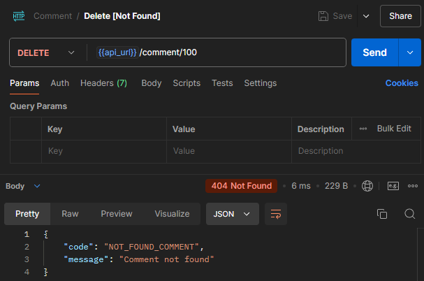 만약 존재하지 않는 댓글에 대한 삭제를 요청한 경우 아래와 같이 '404 Not Found' 응답과 예외 코드 및 메시지를 반환한다.