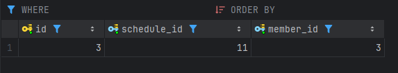 앞서 말한대로 일정이 삭제되면 일정에 지정된 일정 매니저 정보 또한 삭제되도록 구현했기에 'id = 16' 일정이 삭제되자 scheduleManager 테이블에서 'schedule_id = 16' 인 레코드들이 모두 삭제 되었다.