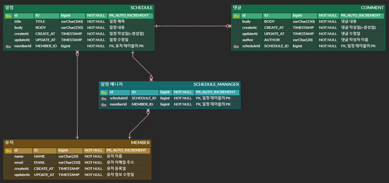 ERD 작성을 작성하고 "어? 하나의 일정에 여러 일정 매니저를 지정할 수 있다면 그냥 '일정 매니저 - 유저' 관계를 ' 1 : N' 으로 해도되는거 아닌가?" 라는 생각이 잠깐 들기도 했다. 하지만 '일정에 해당하는 일정 매니저' 정보를 얻기 위해서 '일정 매니저' 테이블 뿐만 아니라 '유저' 테이블 또한 조회해야 한다는 점과 '일정' 테이블 삭제시 '일정 매니저' 테이블도 함께(영속성 전이) 삭제하고 싶었기에 '고아 객체' 가 생기는 것을 막고자 결국 위와 같은 연관관계를 선택하게 되었다.
