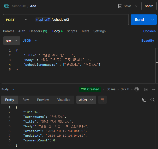먼저 수정사항에 대해 말하자면 유저(=작성자)의 ID 를 전달 받기 위해 쿼리 파라미터가 추가 됬으며 생성 일정에 일정 관리자들을 지정할 수 있게 RequestBody 에 'scheduleManagers' 파라미터가 추가 되었다. 요청 수행 후 반환 값은 기존과 같으며 응답 또한 '201 Created' 로 같다. 반환 값에 일정 매니저 정보가 없으니 DB 의 scheduleManager 테이블을 확인해 보면