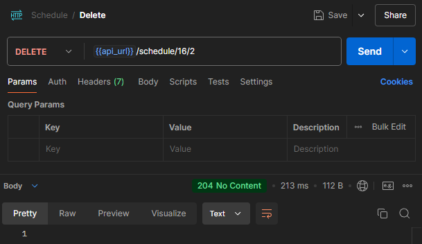 일정 삭제의 경우 요청 URL 이 "/schedule/{scheduleId}/{memberId}" 로 수정되었다. 작성한 유저만 일정을 삭제할 수 있도록 쿼리 파라미터를 추가한 것이다. 일정 삭제의 경우 '204 No Content' 응답만을 반환하므로 요청 수행후 DB 를 살펴봐야 한다.