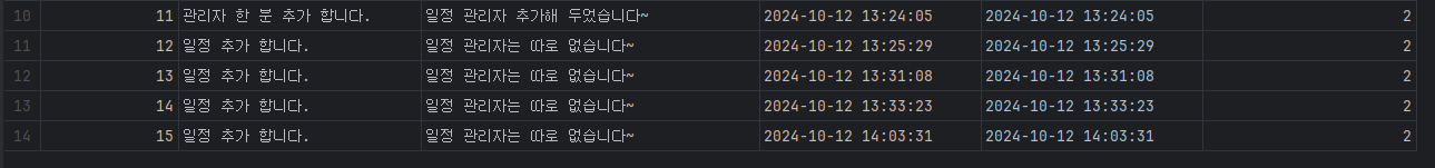새로 생성된 일정에 지정된 일정 매니저(유저)의 정보가 추가된 것을 확인할 수 있다. 테이블을 보면 일정 매니저마다 'scheduleManager' 엔티티를 생성한 것을 볼 수 있는데 이 때문에 JpaRepository 의 'saveAll()' 메서드를 사용했다. 그래서 현재 일정에 지정된 매니저 수만큼 'insert' 쿼리를 날리는데 이 부분은 '배치 인서트' 를 활용하면 한 번에 쿼리를 날릴 수 있다는 정보를 확인했지만 '배치 인서트' 를 사용할 만큼의 대규모 데이터를 다루는 것이 아니라 판단 적용하지 않는 결정을 하였다.