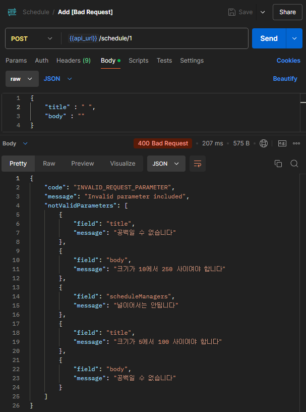 요청 파라미터가 유효하지 않은 경우 이전과 같이 예외 코드 및 메시지와 유효성 검증을 통과하지 못한 파라미터와 통과하지 못한 이유를 반환해두고 '400 Bad Request' 를 응답한다.'scheduleManagers' 의 경우 '@NotNull' 어노테이션을 지정해 검증을 하도록 구현하였다.