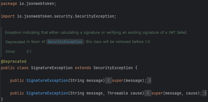 작성된 클래스 설명을 해석해보면 "서명을 계산하거나 JWT의 기존 서명을 확인하는 데 실패했음을 나타내는 예외입니다. SecurityException을 위해 더 이상 사용되지 않습니다. 이 클래스는 1.0 이전에 제거됩니다." 라는 내용인데 나의 경우 "이제 JWT 의 서명 확인 실패에 대한 예외는 'SecurityException' 이 수행하는 구나" 라고 이해했다.
