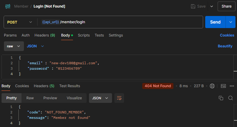 (1) 의 과정에서 일치하는 회원 정보를 DB 에서 조회할 수 없을 경우 아래와 같이 예외 코드 및 메시지를 반환한다.