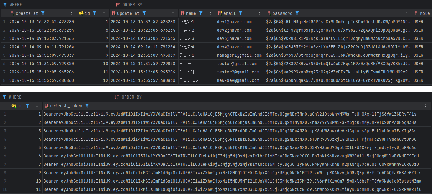 요청 수행 후 DB 의 member, refreshToken 테이블을 확인하면