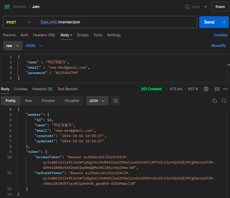 '회원 가입' 에는 회원(유저)의 '이름, 이메일(계정 ID), 비밀번호(계정 비밀번호)' 정보를 전달 받아야 한다. 전달받은 정보로 새로운 회원에 대한 엔티티를 생성후 DB 에 저장하며, 신규 토큰(accessToken, refreshToken)들을 생성한다. 모든 과정을 마치면 신규 회원의 정보(비밀번호 제외)와 생성한 토큰들을 함께 반환해준다.