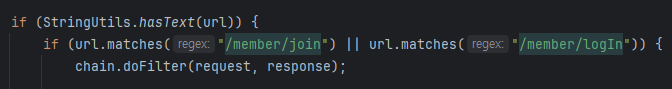 아래의 요청들은 필터에서 인증/인가를 수행하지 않고 곧장 'MemberController' 에 'ServletRequest, ServletResponse' 를 전달하게 된다.